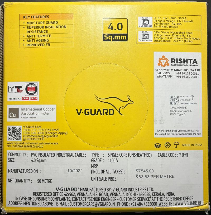 Enjoy ultimate safety with V-Guard Classo Wires. Equipped with a 3-layer insulation technology, Classo ensures enhanced electrical and fire safety. Its moisture guard feature resists the attack of moisture as it is armed with copper insulation through which the copper retains its brightness and doesn’t turn black, even in adverse conditions. It also offers extra flexibility to adapt to each turn and corner for easy wiring. Made using 99.7% pure copper, Classo enables highest conductivity and ensure best electrical properties. The choice of material also ensures good conductor properties and wires have a long life. Also, it comes to you with an assurance of “90 m ASSURED” seal, a unique marking that ensures the length of the wire is nothing short of what it claims to be. Designed to withstand extreme temperatures (70°C), Classo wires possess flame retardant properties thus prevents propagation in case of short circuits & fire breakouts. Classo also ensures pulling easiness with its smooth surface. Manufactured in accordance with BIS requirements at ISO 9001, ISO 14001 & ISO 45001 certified manufacturing plants; V-Guard Classo Wires are available in a wide range of colours - Red, Yellow, Blue, Black, Green, Grey & White. Switch to V-Guard Classo Wires and ensure long-lasting protection.